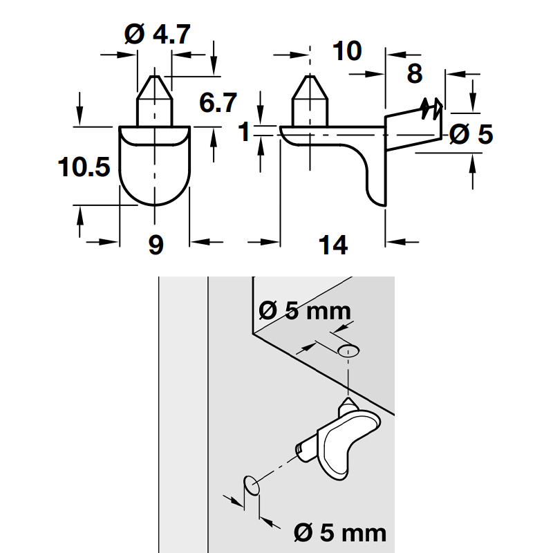 • Lắp đặt: Lắp ấn vào lỗ khoan Ø5 mm