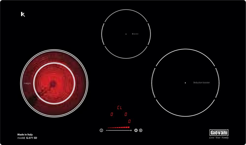 Bếp điện từ Giovani G-371 SD gồm 3 vùng nấu với tổng công suất là 5900W, vùng nấu hồng ngoại phải đường kính mâm từ 140cm và 210cm có công suất 1000W và 2200W, vùng nấu giữa có công suất 1400W, vùng nấu trái phảicó công suất 2000W khi kích hoạt tính năng Booster công suất đạt 3000W. Chức năng Booster ở vùng từ nấu siêu nhanh, tuy nhiên thời gian tối đa mặc định dùng chức năng này là 10 phút/lần tránh quá tải.