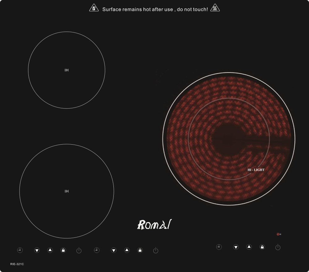 - Bếp ba Romal RIE-321C là sự kết hợp hoàn hảo của bếp từ và bếp điện từ. Với thiết kế 3 khu vực bếp nấu giúp tiết kiệm thời gian nấu nướng tối đa. Mặt bếp điện từ ba Romal RIE-321C được làm từ kính Crystal sợi thủy tinh tổng hợp, chịu lực 25kg, chịu nhiệt lên đến 600oC. Mặt kính luôn sáng bóng, dễ dàng vệ sinh.