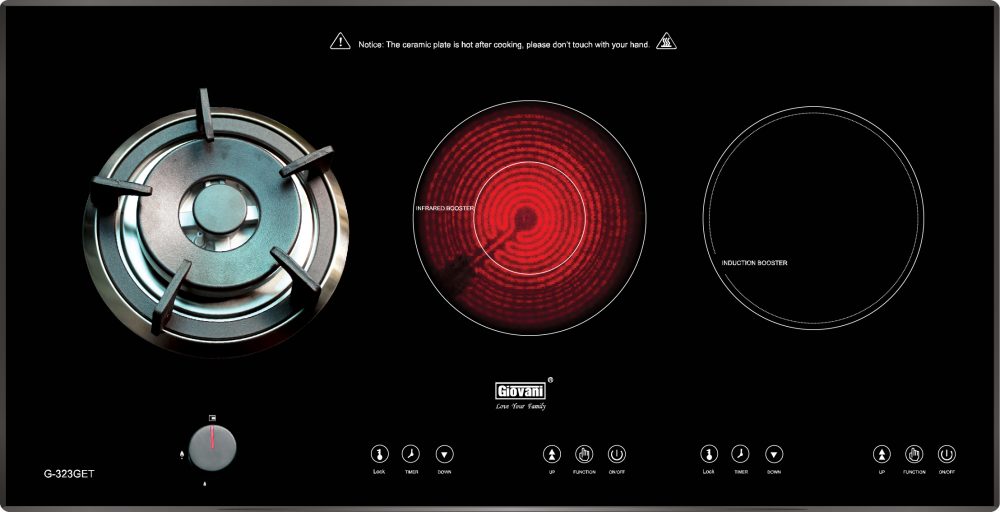 Giovani G-323 GET là mẫu bếp ga kết hợp 1 từ và 1 hồng ngoại mang đầy đủ những tính năng thông minh của các dòng bếp gas, bếp từ, bếp hồng ngoại trên thị trường. Bếp gas kết hợp điện từ hồng ngoại Giovani G-323 GET thiết kế kiểu lắp âm bàn bếp kết hợp với bề mặt bằng kính đen cao cấp dày 8mm chịu lực và chịu nhiệt cực cao, bề mặt kính này chống trầy xước hiệu quả, dễ dàng vệ sinh mà còn làm tăng nét sang trọng cho sản phẩm. Vì vậy, việc lắp đặt cho gia đình chiếc bếp hỗn hợp này sẽ đáp ứng tối đa nhu cầu đun nấu cho gia đình bạn.