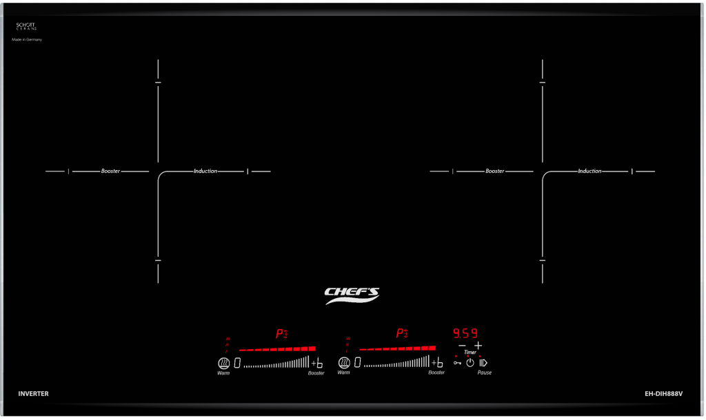 - Tiện lợi với các tính năng thông minh: Bếp từ Chefs EH-DIH888V có bàn phím điều khiển dạng trượt slide và 9 mức công suất đi kèm với tính năng booster. Bạn có thể dễ dàng hẹn giờ độc lập cho từng vùng nấu và sử dụng tính năng dừng tạm thời khi cần thiết.