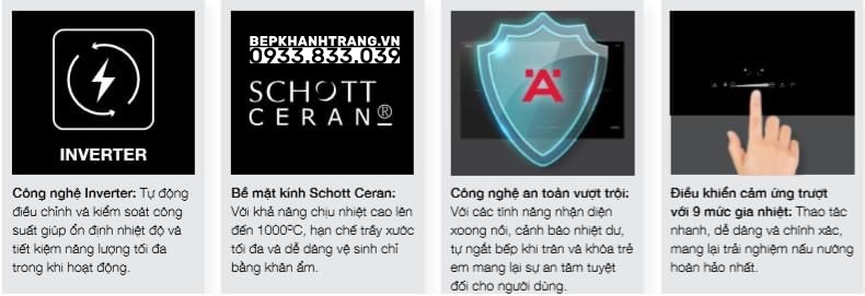 – Vùng giữa: Ø180 mm – 1,4 kW – Vùng bên trái: Ø220 mm – 2,3/3,0 kW (gia nhiệt nhanh) – Vùng bên phải: Ø270 mm – 2,3/3,0 kW (gia nhiệt nhanh) |