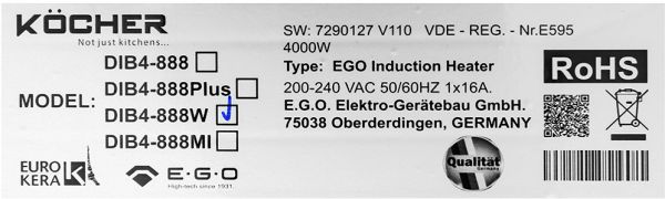 Tem phụ thể hiện chi tiết các thông số cơ bản về – Bếp từ Kocher DIB4-888W – Được dán phía dưới bụng bếp