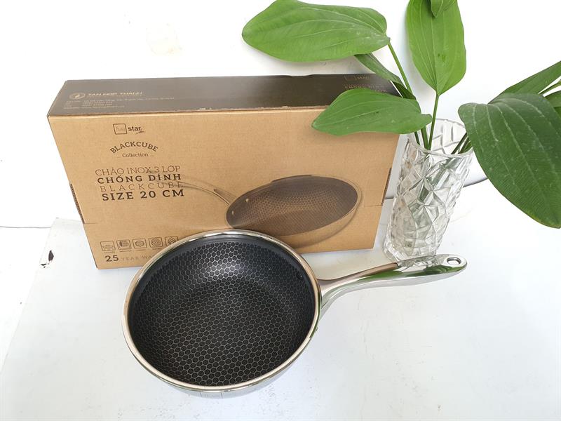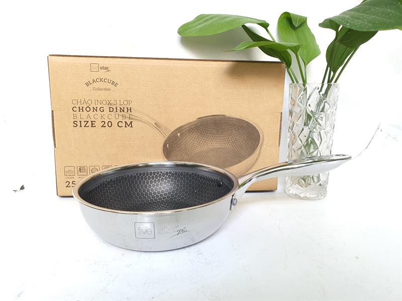 •Chảo Sâu Blackcube Inox 3 Lớp Đúc Liền Đáy Từ Chống Dính Five Star 20 cm được sản xuất từ inox 304-nhôm- inox 430 bền đẹp, cứng chắc.