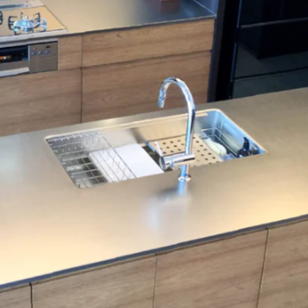 - Chậu đơn hình chữ nhật có kích thước tiêu chuẩn, phù hợp với nhiều không gian bếp hiện đại. Hệ thống ray trượt hai bên miệng chậu cho phép bạn dễ dàng đặt và di chuyển khay đựng xà phòng hoặc phụ kiện rửa, giúp thao tác tiện lợi, gọn gàng và linh hoạt hơn trong quá trình sử dụng.