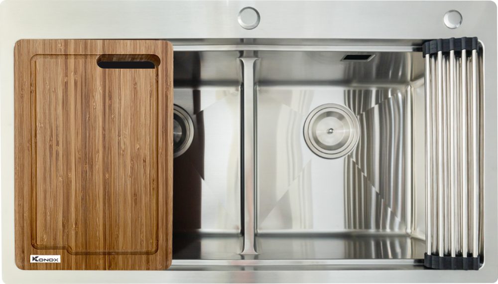 Chậu rửa Konox KN8850TD được tối ưu công năng nhờ thiết kế hạ bậc, tích hợp phụ kiện đi kèm mang tới trải nghiệm tuyệt vời trong thao tác làm bếp. Với bề ngang 880mm, chậu thích hợp với khu vực bàn bếp có diện tích tương đối rộng.