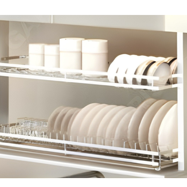 - Thiết kế hai tầng riêng biệt tạo không gian chứa khoa học, giúp phân loại bát và đĩa gọn gàng, dễ dàng tìm lấy khi cần.
