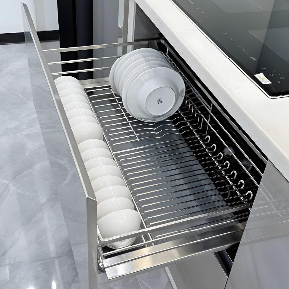 - Chất liệu inox SUS304 nan Oval không chỉ mang lại độ bền vượt trội mà còn đảm bảo an toàn khi sử dụng. Bề mặt điện hóa xước mờ giúp giảm thiểu trầy xước, hạn chế bám bẩn, dễ dàng lau chùi. Ngoài ra, khay hứng nước bằng nhựa ABS có nẹp nhôm giúp ngăn chặn tình trạng nước đọng trong tủ, đảm bảo vệ sinh cho khu vực để bát đĩa.