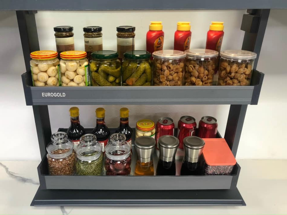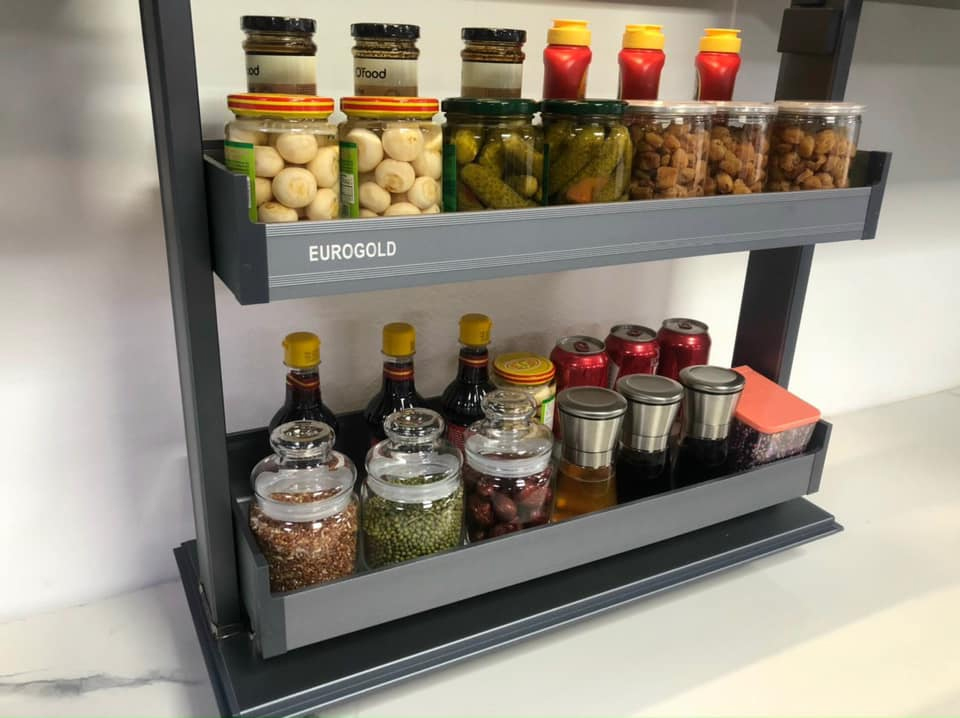 Giá gia vị điện tự động | Eurogold EMS700 | chỉ với một thao tác chạm nhẹ | tủ sẽ tự động kéo xuống và đẩy lên.