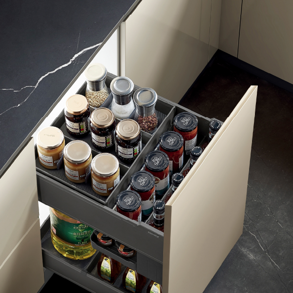 - Thiết kế thông minh: Ngăn kéo thu gọn trong hộc tủ giúp tiết kiệm không gian, khay đựng linh hoạt phù hợp với lọ gia vị, chai dầu và các vật dụng nhà bếp khác.