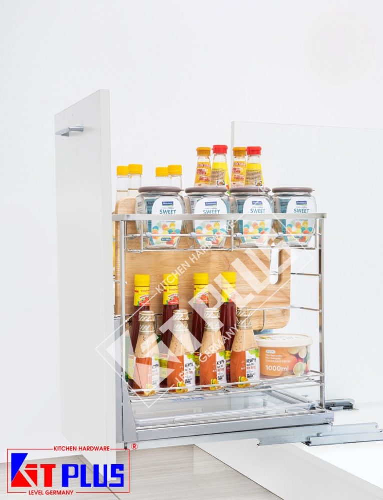 Giá gia vị | chai lọ | Kit Plus DS.40 | dạng nan dẹt | inox SUS304 theo tiêu chuẩn Nhật Bản JIS G4303 | Bề mặt điện hóa xước mờ | Ray âm giảm chấn