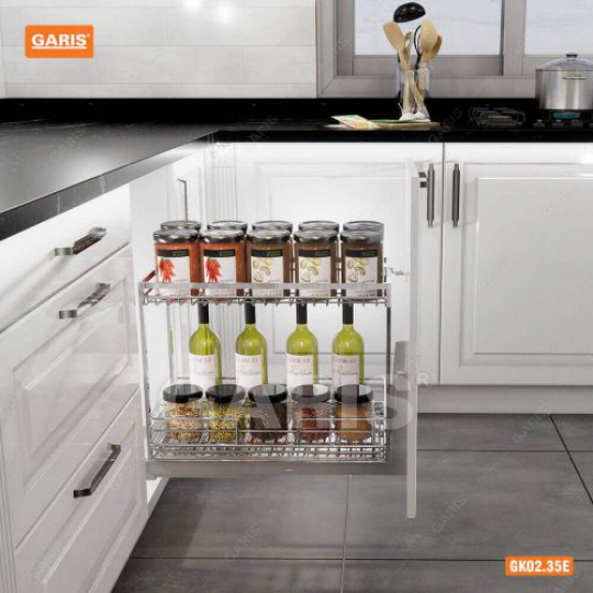 Nếu sắp xếp chúng trên mép bệ bếp thì rất gần tầm tay trẻ em không tránh khỏi bể vỡ hay cũng rất mất thời gian vệ sinh thường xuyên bởi dầu mỡ khi nấu nướng. Giá chai lọ gia vị nan vuông Garis GK02.40E đươc thiết kế dạng nox nan tạo nên sự tinh tế trong từng chi tiết có thể cảm nhận được trong từng đường nét cho phụ kiện tủ bếp.