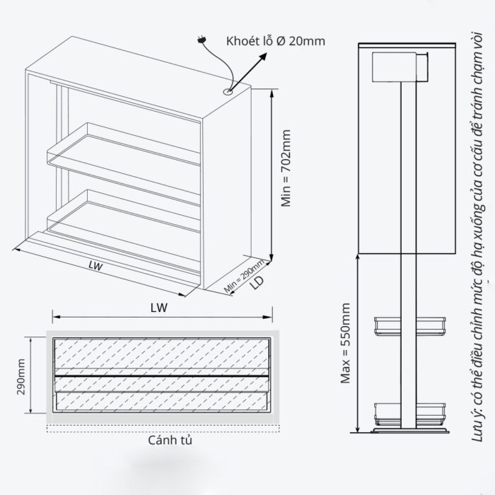- Kích thước lắp đặt: R864 x S290 x C ≥ 700 mm.