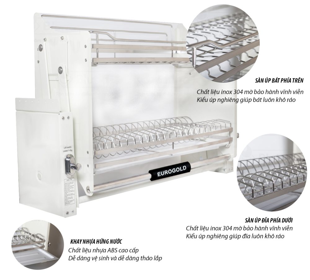 Giá bát đĩa nâng hạ Eurogold EVI190 được thiết kế 1 khay đựng nước cho 2 tầng trên và dưới, giúp bát đĩa nhà bạn luôn khô ráo, sạch sẽ. Ngăn để bát đĩa được thiết kế bởi chất liệu INOX SUS304 theo tiêu chuẩn Châu Âu, bề khung rổ mặt điện hóa xước mờ cực bền bỉ, nỗi lo rỉ sét sẽ không còn tồn tại với các bà nội trợ.