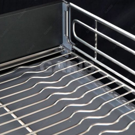 Giá xoong nồi cánh kéo giảm chấn MP02.70V với ray hộp giảm chấn; vật liệu inox 304 theo tiêu chuẩn Nhật Bản JIS G4303. Bề mặt hoàn thiện điên hoá tạo sự trơn mượt ánh bóng