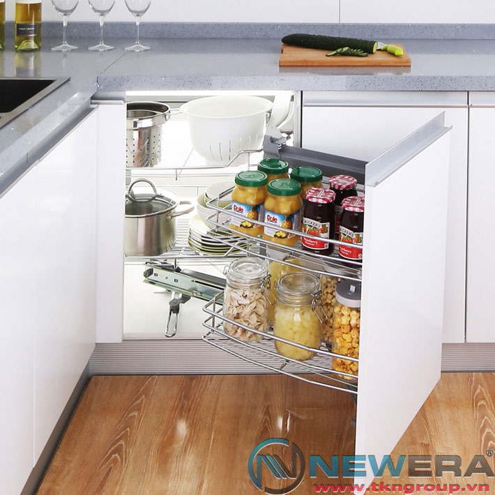 - Kệ góc xoay liên hoàn Newera NE0201CR với 4 rổ đựng riêng biệt nhưng lại chỉ ở duy nhất 1 khoang của góc tủ bếp dưới.