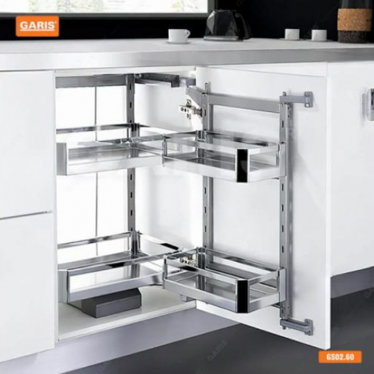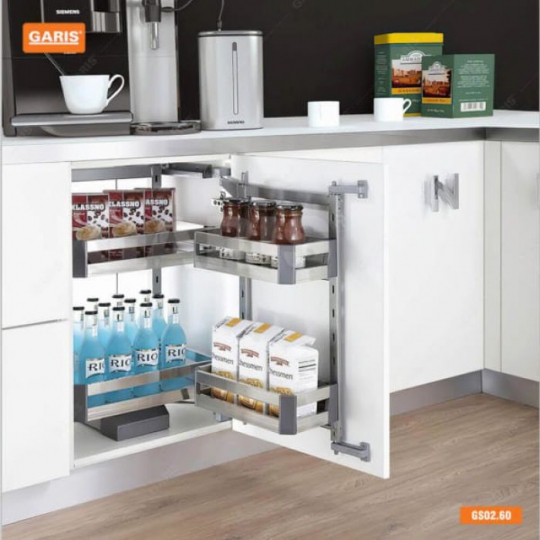 Hệ giá kho 2 tầng inox Garis có thể lắp đặt cho tủ bếp dưới vị trí cuối cùng của tủ bếp dưới hoặc cũng có thể lắp đặt vào vị trí tủ bếp trên. Khi lắp vào bếp trên có một ưu điểm là khi ở cánh ra thì hệ thống ray đưa những khay chứa sản phẩm kéo ra ngoài nên dễ dàng lấy đồ trong tủ bếp trên-vốn cao và khó lấy cho người nội trợ.