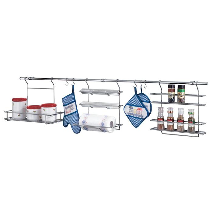 Trọn bộ gồm: | Hai thanh treo dạng tròn dài 750mm Ba bas treo. 5 móc treo chữ S Một kệ để giấy cuộn 3 tầng, kích thước 350x166mm Một giá đa năng kích thước 350x180mm. Một giá treo gia vị kích thước 350x88mm |