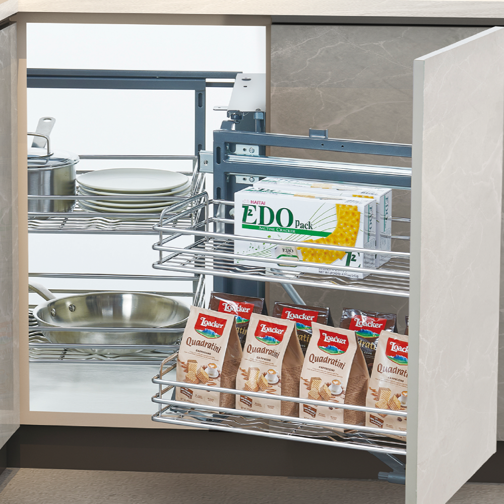 - Tối ưu không gian góc tủ: Kệ 2 tầng giúp tận dụng góc chết hiệu quả, sắp xếp đồ gọn gàng, dễ dàng lấy đồ chỉ với một thao tác kéo.