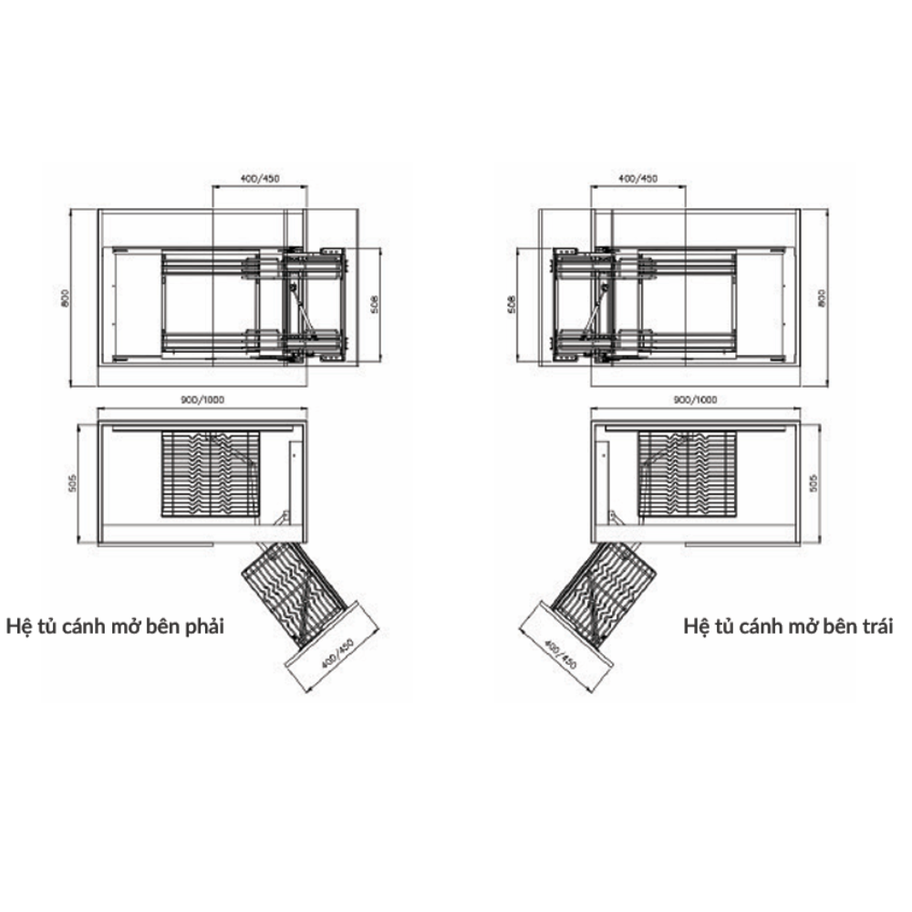 - Kích thước tiêu chuẩn: Phù hợp với tủ bếp có chiều rộng 900-1000mm, chiều sâu ≥530mm và khoảng hở cánh ≥450mm.