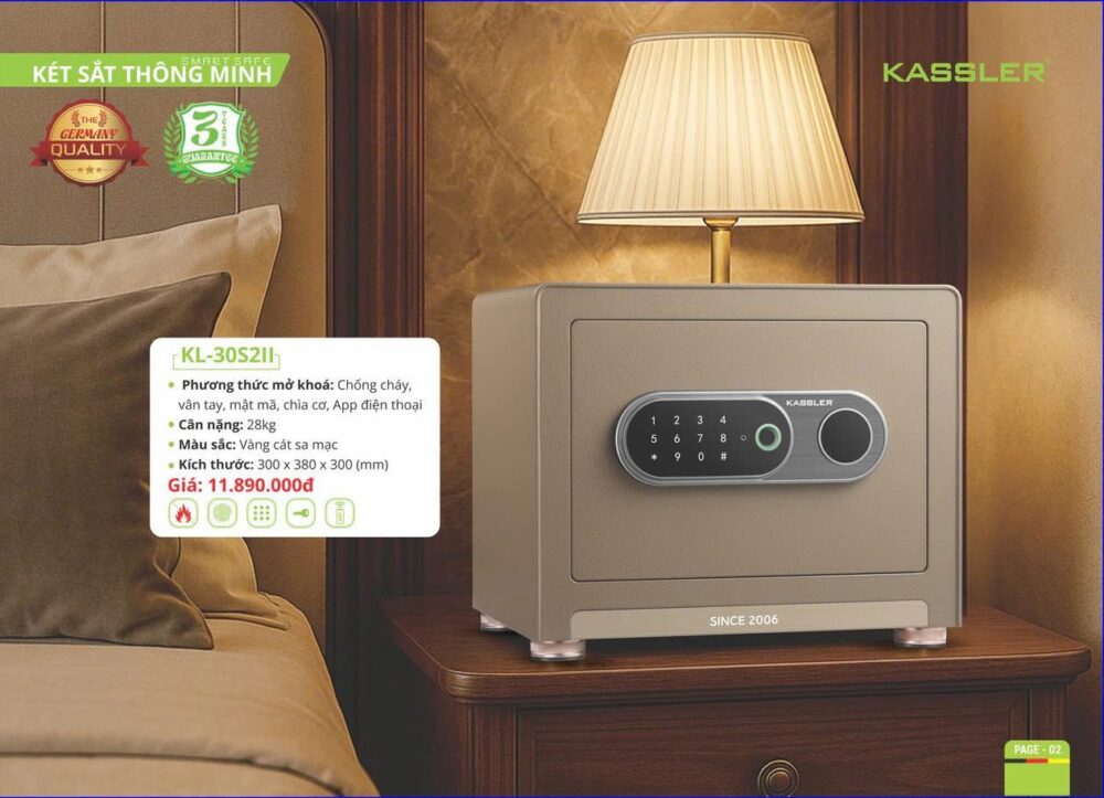 - Kassler KL-30S2II là mẫu két sắt thông minh hiện đại, đáp ứng đầy đủ các tiêu chí về bảo mật, thiết kế và tiện ích sử dụng. Với kích thước nhỏ gọn (300x380x300 mm) và trọng lượng 28 kg, sản phẩm phù hợp lắp đặt trong tủ, kệ hoặc góc phòng mà vẫn đảm bảo tính an toàn, chắc chắn. Màu vàng cát sa mạc tạo cảm giác sang trọng, dễ phối hợp với không gian nội thất cao cấp.