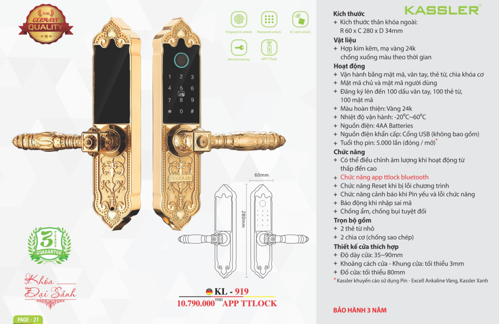 - Khóa đại sảnh Kassler KL-919 APP là một giải pháp an ninh thông minh và hiện đại, được thiết kế theo tiêu chuẩn Đức với nhiều tính năng vượt trội, đáp ứng nhu cầu bảo vệ an toàn cho các cửa đại sảnh có lưu lượng người ra vào lớn. Sản phẩm nổi bật với đa dạng phương thức mở khóa như vân tay, mật mã, thẻ từ và chìa khóa cơ, tạo sự tiện lợi và linh hoạt cho người dùng.