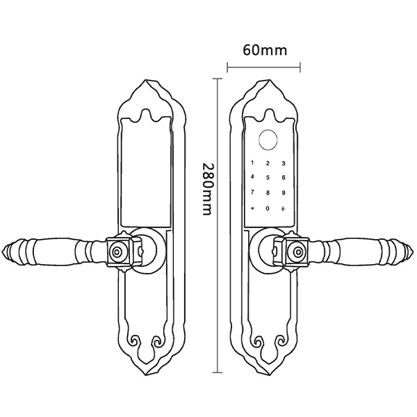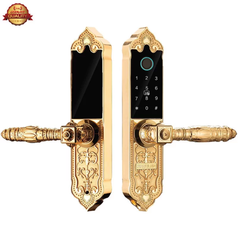 - Về mặt thiết kế, khóa sử dụng hợp kim kẽm mạ vàng 24K cao cấp, vừa đảm bảo độ bền, chống xuống màu vừa giữ vẻ sang trọng, đẳng cấp cho cửa đại sảnh. Khả năng chống ẩm, chống bụi tuyệt đối giúp khóa hoạt động ổn định trong nhiều điều kiện môi trường khác nhau.