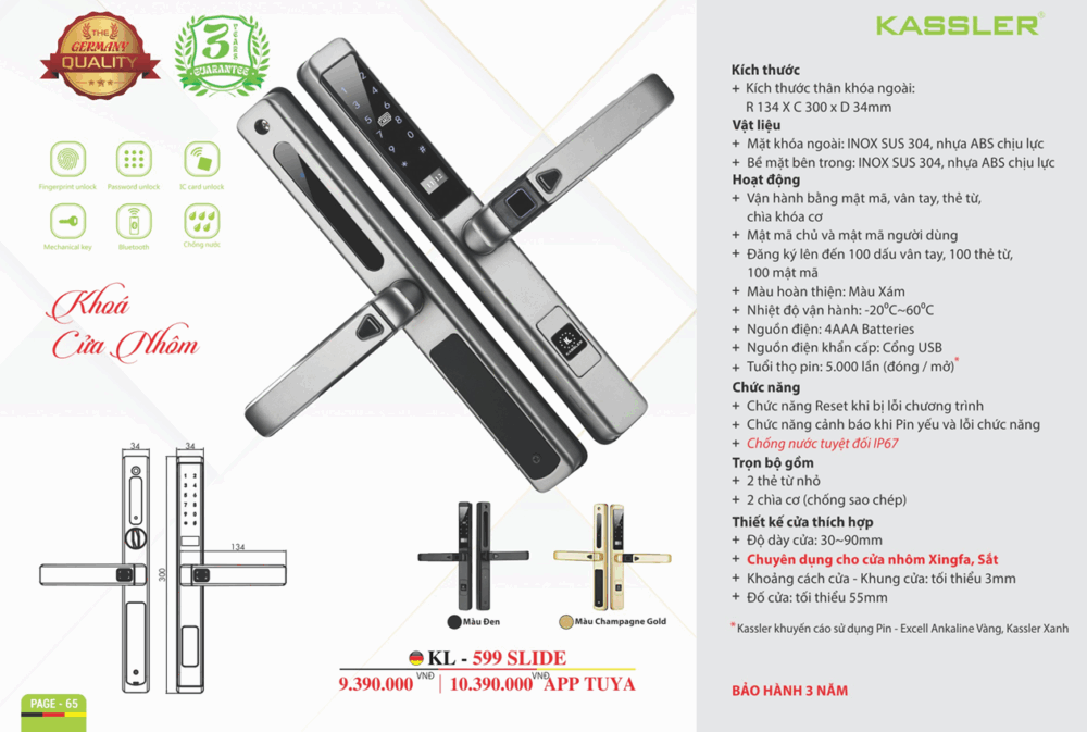 THÔNG SỐ KỸ THUẬT Khóa vân tay cửa nhôm Kassler KL-599 SLIDE BLACK