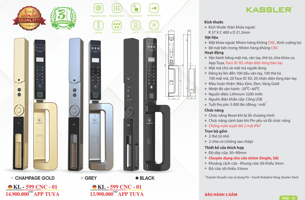 THÔNG SỐ KỸ THUẬT Khóa vân tay cửa nhôm Kassler KL-599 CNC-01 CHAMPAGNE GOLD