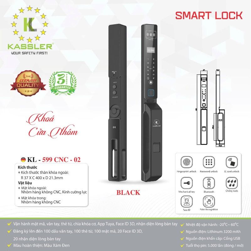 THÔNG SỐ KỸ THUẬT Khóa vân tay cửa nhôm Kassler KL-599 CNC-02 BLACK