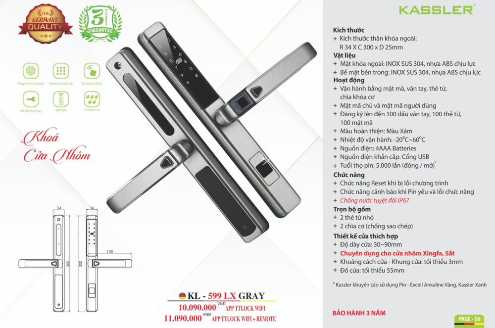THÔNG SỐ KỸ THUẬT Khóa vân tay cửa nhôm Kassler KL-599 LX GREY APP