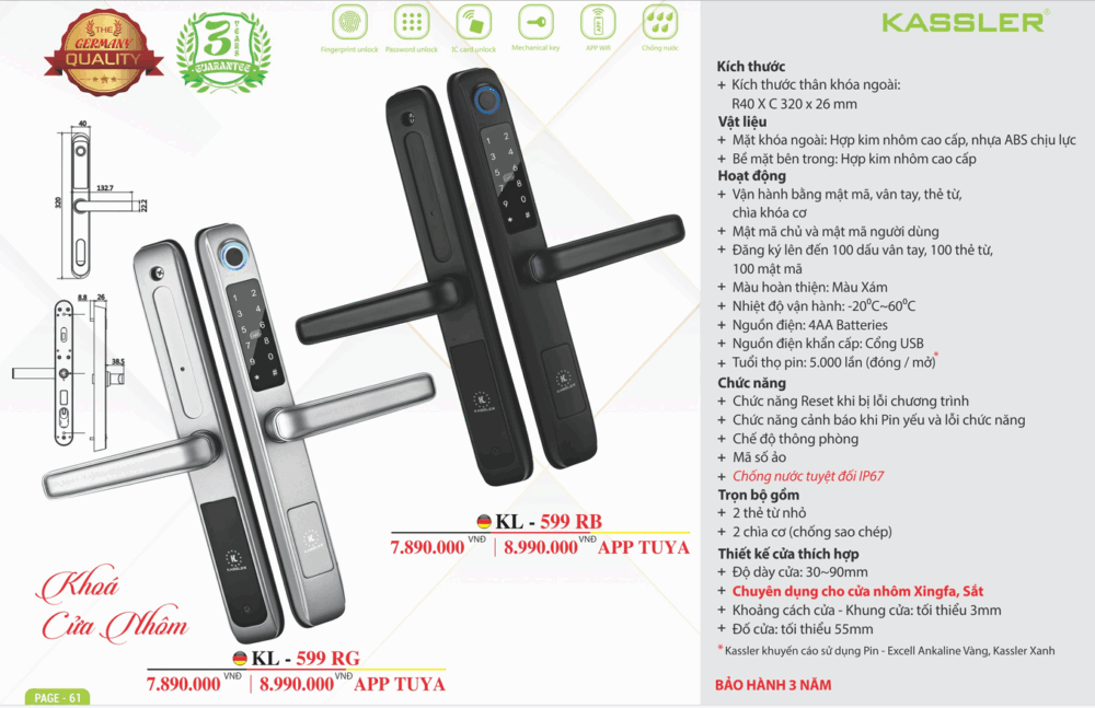 THÔNG SỐ KỸ THUẬT Khóa vân tay cửa nhôm Kassler KL-599 RB