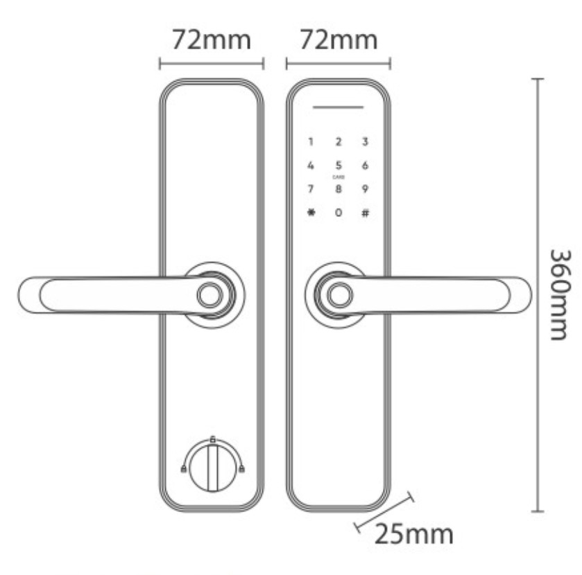 - Kích thước thân khóa ngoài: 72 (R) x 360 (C) x 25mm (D)