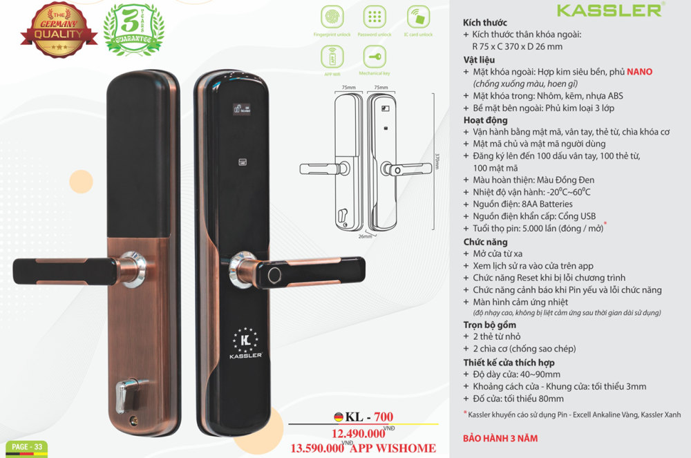 - Tổng thể, Kassler KL-700 APP là lựa chọn đáng tin cậy trong phân khúc khóa thông minh trung – cao cấp, vừa đảm bảo an ninh, vừa mang lại sự tiện nghi và hiện đại cho người dùng.