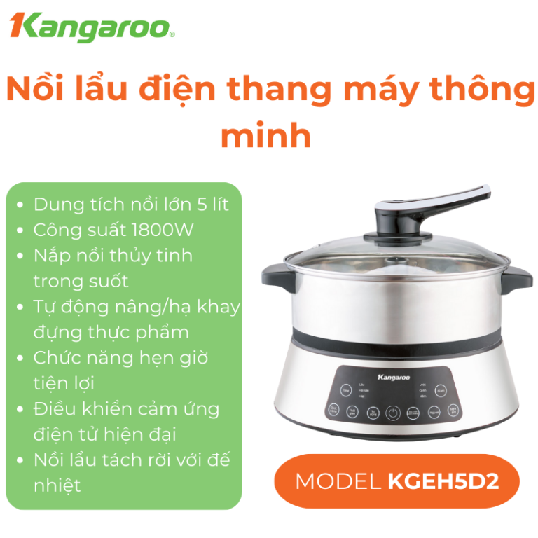 - Lẩu điện thang máy Kangaroo KGEH5D2 là lựa chọn lý tưởng cho những gia đình yêu thích món lẩu nhưng không muốn tốn quá nhiều thời gian nấu nướng. Với công suất 1800W, chiếc lẩu điện này giúp nấu ăn nhanh chóng và hiệu quả, tiết kiệm thời gian tối đa, đặc biệt khi có những bữa tiệc đông người. Dung tích 5 lít của nồi cho phép bạn nấu một lượng thực phẩm lớn, rất phù hợp cho các gia đình hoặc nhóm bạn từ 4-6 người.