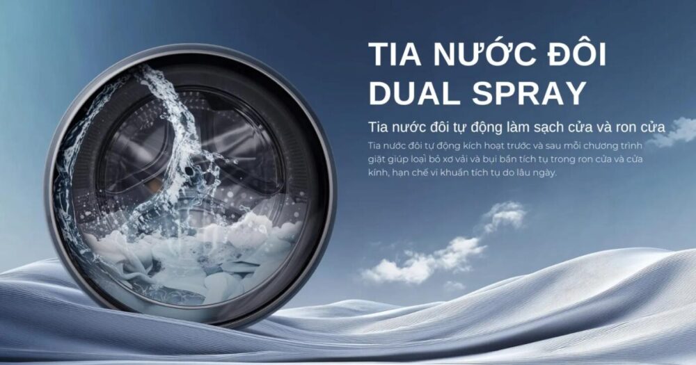 Hệ thống tia nước đôi Smart Dual Spray tự động làm sạch mặt trong cửa và vòng đệm sau mỗi lần giặt. Nhờ đó, máy hạn chế cặn bẩn, vi khuẩn tích tụ, giữ khoang giặt luôn sạch sẽ và nâng cao độ bền sản phẩm.