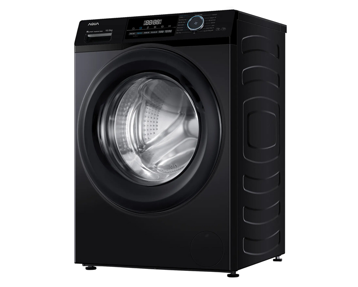 Máy giặt Aqua 8.5 kg có thiết kế cửa trước – lồng ngang, tông màu đen sang trọng, tạo điểm nhấn tinh tế cho không gian sống. Bảng điều khiển song ngữ Anh – Việt kết hợp núm xoay và nút nhấn với màn hình hiển thị rõ ràng, giúp thao tác giặt giũ dễ dàng.
