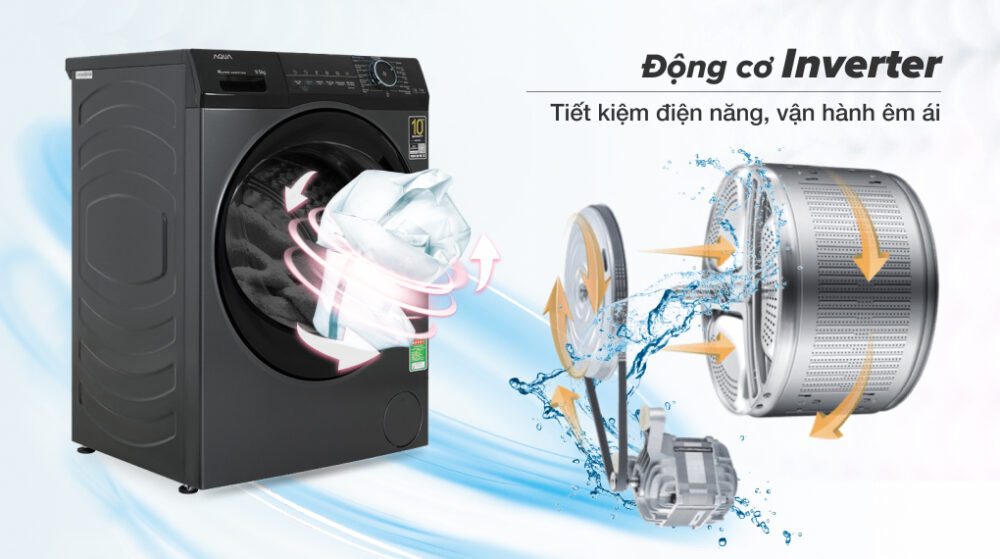 - Aqua trang bị cho model này nhiều công nghệ đáng chú ý như cân bằng AI DBT giúp máy vận hành ổn định, hạn chế rung ồn trong suốt quá trình giặt. Công nghệ Smart Dual Spray tự động làm sạch cửa và vòng đệm, giữ khoang giặt luôn sạch sẽ. Động cơ BLDC Inverter góp phần tiết kiệm điện năng, đạt nhãn năng lượng 5 sao.