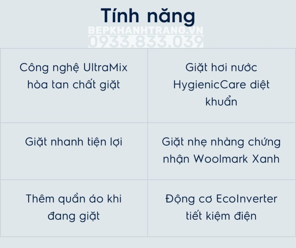 - Công nghệ HygienicCare giúp loại bỏ 99.2% tác nhân gây dị ứng như Der f1 (mạt bụi), Fel d1 (có ở mèo), đồng thời giảm đến 99.9% vi khuẩn Staphylococcus aureus, Klebsiella pneumonia khi giặt ở 40°C, chương trình giặt đồ Cotton