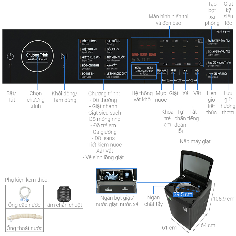 - Chế độ giặt: Đồ thường, giặt nhanh, giặt siêu sạch, đồ mỏng nhẹ, đồ trẻ em, ga giường, đồ jeans, tiết kiệm nước, xả + vắt, vệ sinh lồng giặt
