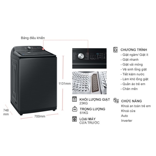 - Khối lượng giặt: 23 kg