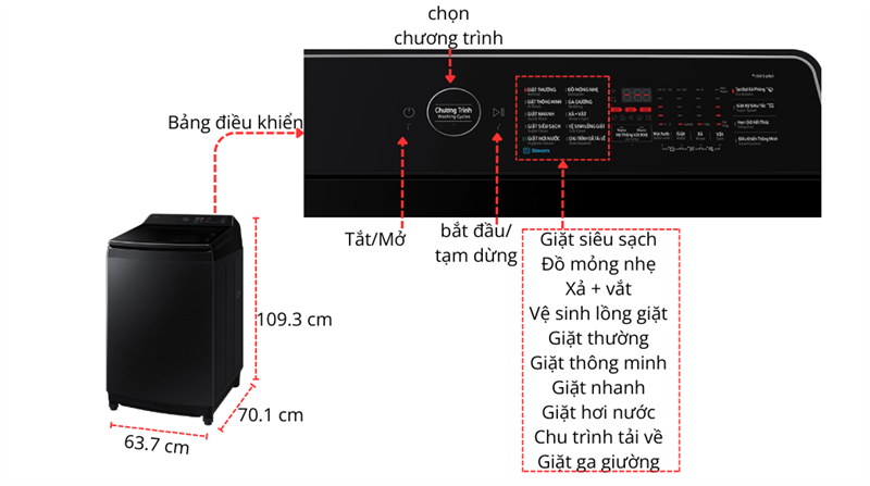 - Chế độ giặt: Đồ thường, giặt nhanh, giặt siêu sạch, đồ mỏng nhẹ, đồ trẻ em, ga giường, đồ jeans, tiết kiệm nước, xả + vắt, vệ sinh lồng giặt