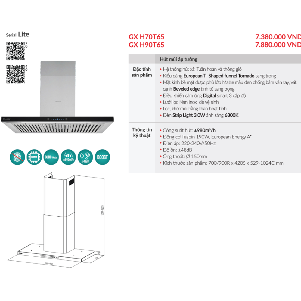 THÔNG SỐ KỸ THUẬT Máy hút mùi áp tường GrandX GX H90T65