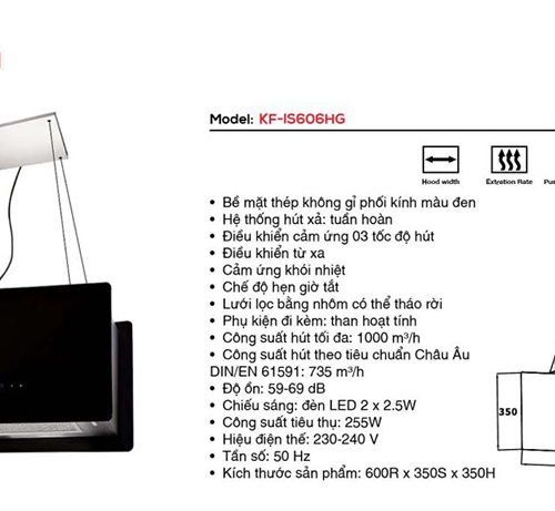 THÔNG SỐ KỸ THUẬT VÀ LẮP ĐẶT MÁY HÚT MÙI BẾP 6 TẤC TREO ĐẢO ĐỘC LẬP KAFF KF-IS606GH