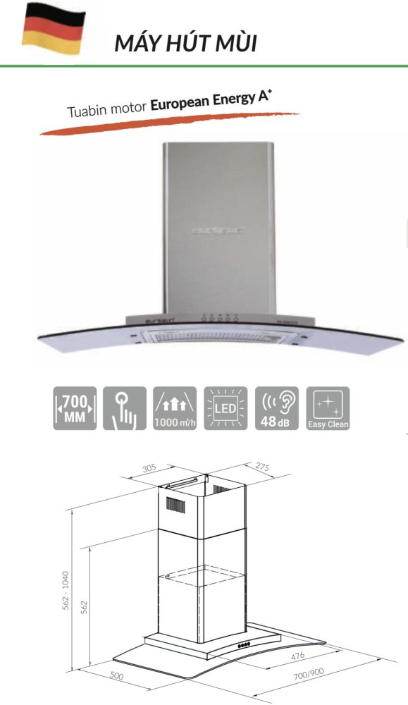 Đây là dòng sản phẩm treo tường của Eurosun, với các chức năng đặc biệt, được lắp ráp bởi vật liệu hạng nhất giúp làm sạch không khí, giữ căn bếp trở lên thoáng mát và đảm bảo yếu tố thẩm mỹ cũng như tính bền bỉ theo thời gian. Máy phù hợp với những không gian bếp hiện đại, tăng thêm vẻ sang trọng cho gian bếp của bạn. Chất liệu của máy được làm bằng chất liệu inox và kính cường lực tăng độ bền cho máy và độ an toàn cho người sử dụng.