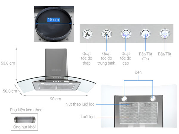 Điều khiển nút nhấn ở mặt trước của máy hút mùi chỉnh 3 tốc độ quạt, bật/tắt đèn linh hoạt, đáp ứng nhu cầu sử dụng