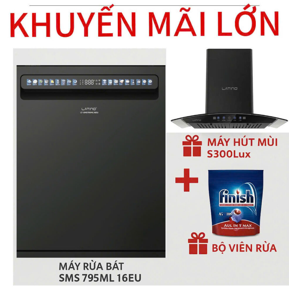 - Máy rửa bát Latino SMS 795ML 16EU là lựa chọn hoàn hảo dành cho các gia đình hiện đại đang tìm kiếm thiết bị nhà bếp vừa hiệu quả vừa tiện lợi. Với dung tích rửa lên đến 16 bộ bát đĩa chuẩn châu Âu, sản phẩm đáp ứng tốt nhu cầu của những gia đình đông người hoặc những dịp tiệc tùng, giúp tiết kiệm đáng kể thời gian và công sức rửa chén đĩa hàng ngày.