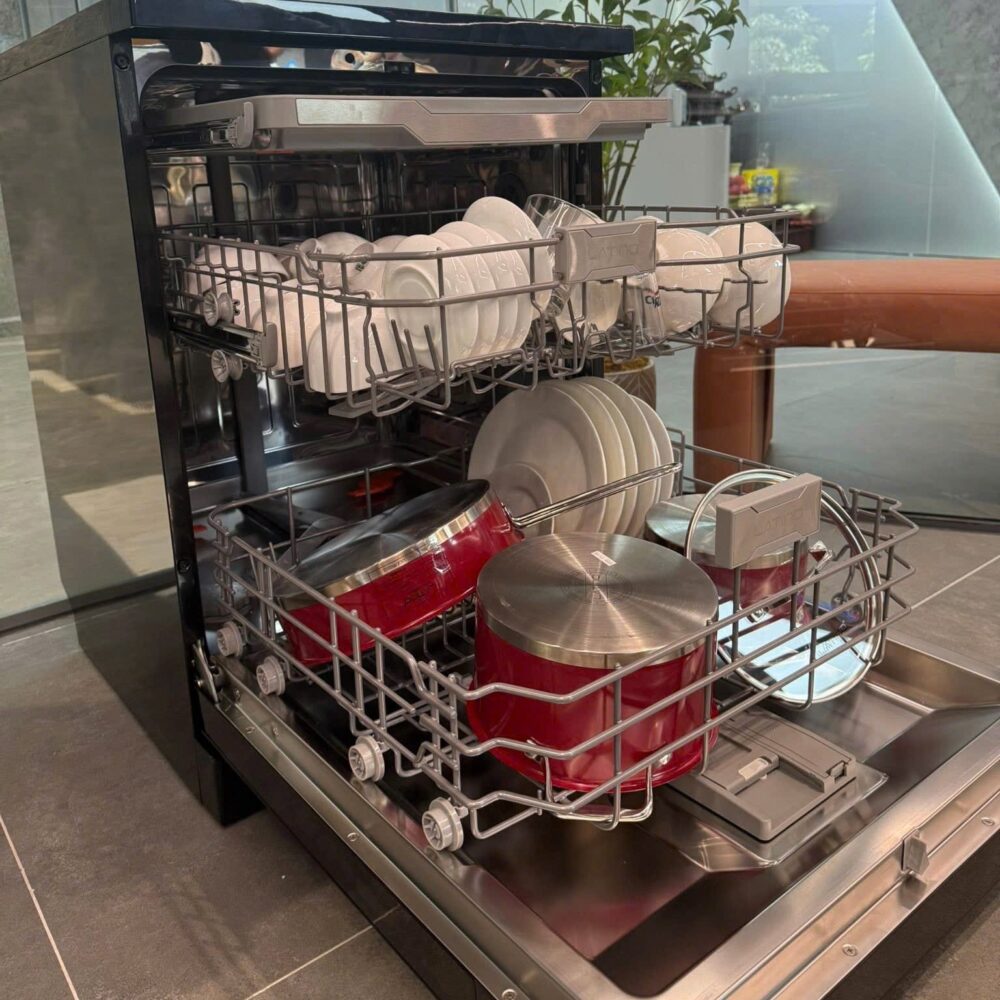 - Dung tích lớn 16 bộ: Rửa được lượng bát đĩa lớn, phù hợp cho gia đình đông người hoặc các bữa tiệc, tiết kiệm thời gian rửa chén đĩa liên tục.