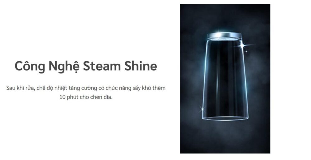 Sau chu trình rửa, Steam Shine sẽ gia tăng nhiệt độ để sấy khô chén dĩa thêm khoảng 10 phút. Hơi nước nóng giúp hạn chế đọng nước và mùi ẩm khó chịu. Nhờ đó, chén dĩa khô ráo nhanh chóng, sẵn sàng để sử dụng hoặc cất gọn.