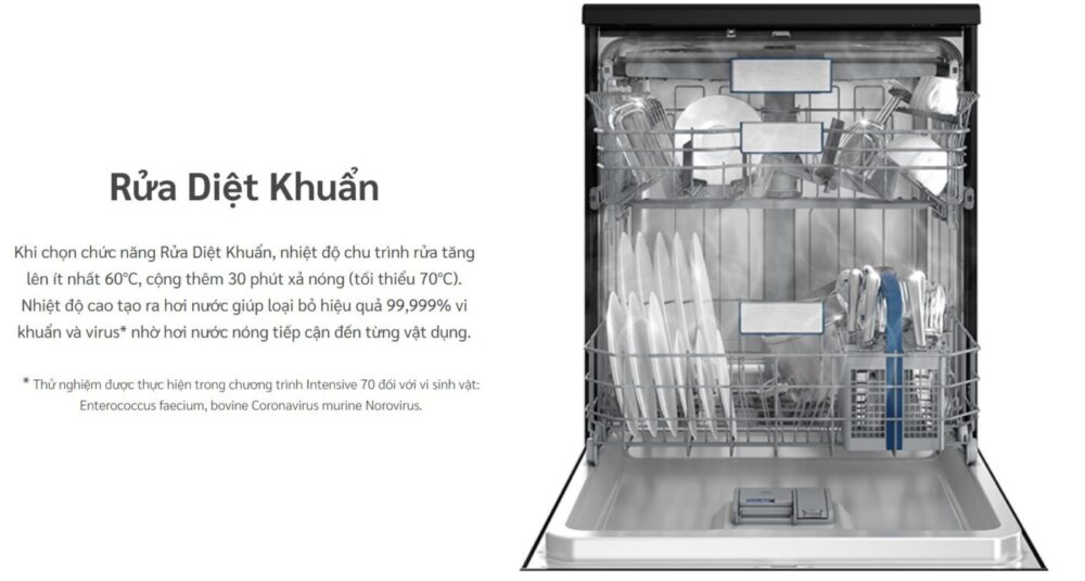 Chức năng Rửa Diệt Khuẩn nâng nhiệt độ nước lên tối thiểu 60°C và xả nóng ở mức 70°C. Hơi nước nhiệt độ cao giúp loại bỏ đến 99,999% vi khuẩn và virus bám trên bề mặt chén dĩa. Tính năng này đặc biệt phù hợp cho gia đình có trẻ nhỏ hoặc người lớn tuổi.
